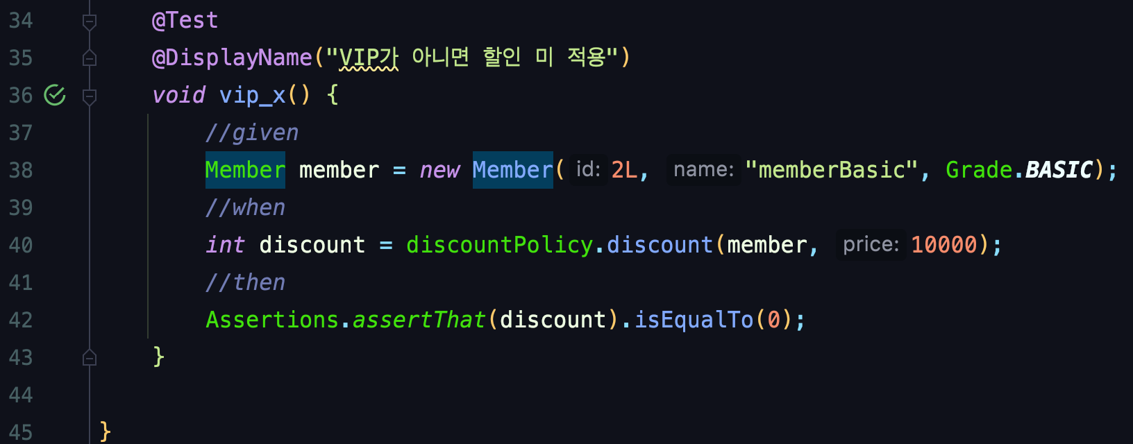 discount์์๋ Member ๊ฐ์ฒด์ ๊ตฌ์ ๊ฐ๋ฅผ ์ ๋ ฅ ๋ฐ์ Member ๋ฑ๊ธ์ด VIP๋ผ๋ฉด ๊ตฌ์ ๊ฐ์ 10์ ๊ณฑํ ๋ค ๋๋๊ธฐ 100์ ํ์ฌ 10% ํ ์ธ์ ๋ฐ๋๋ก ํ์ฌ ๋ฐํํ๊ณ , VIP๊ฐ ์๋๋ผ๋ฉด 0์ ๋ฐํํ์ฌ ํ ์ธ์ด ์๋๋ก ๊ตฌํ ํ ๊ฒ์ด์์.