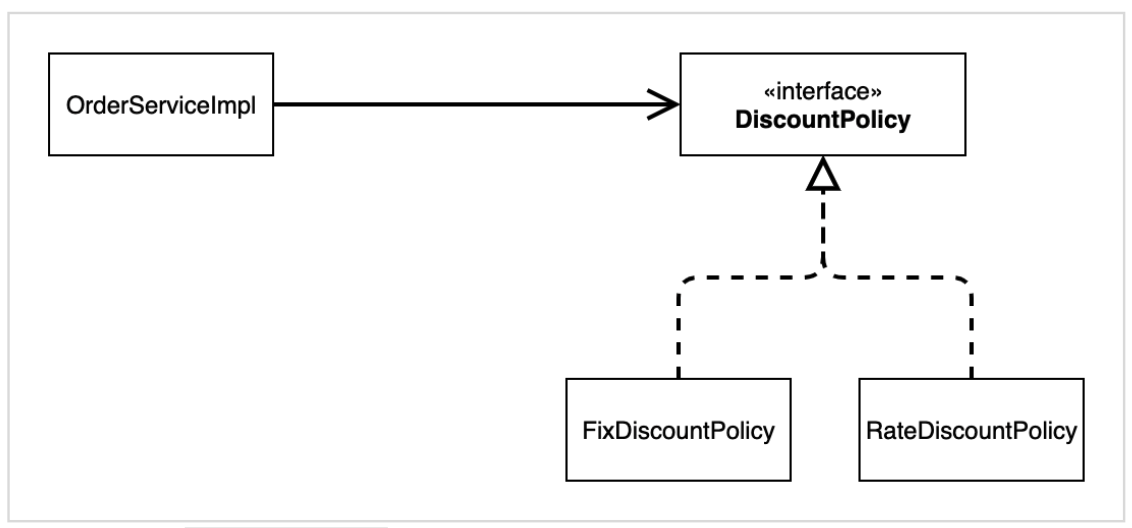- ๊ตฌ์ฒด(๊ตฌํ) Class ์์กด : FixDiscountPlicy, RateDiscountPolicy