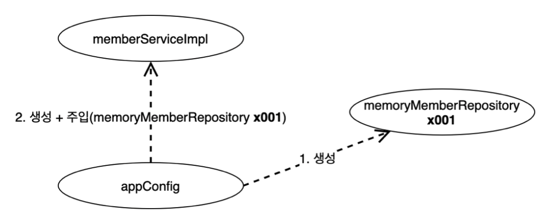 'appConfig' ๊ฐ์ฒด๋ 'memoryMemberRepository' ๊ฐ์ฒด๋ฅผ ์์ฑํ๊ณ , ๊ทธ ์ฐธ์กฐ๊ฐ์ 'memberServiceImpl'์ ์์ฑํ๋ฉด์ ์์ฑ์๋ก ์ ๋ฌํ๋ ๊ฒ์ด์์.
