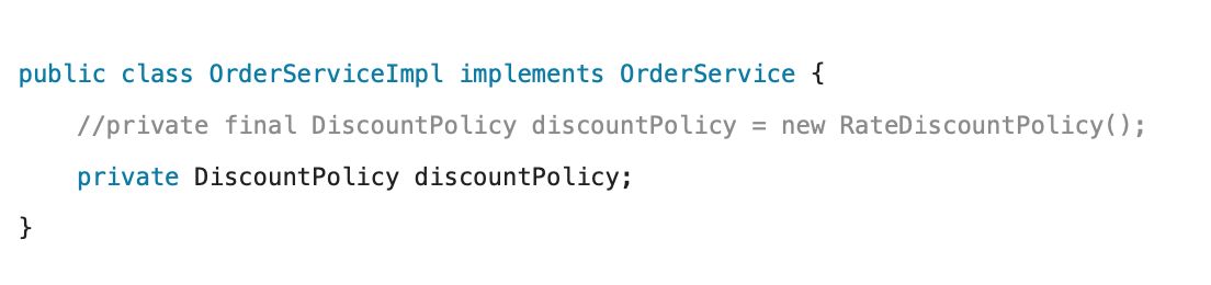 ํ๋(17๋ฒ์งธ ์ค)์ ๋ณด๋ฉด ์ด์ ๋ ์ด์ OrderServiceImpl์ FixDiscountPolicy๋ฅผ ์์กดํ์ง ์๋ ๊ฒ์ด์์.
