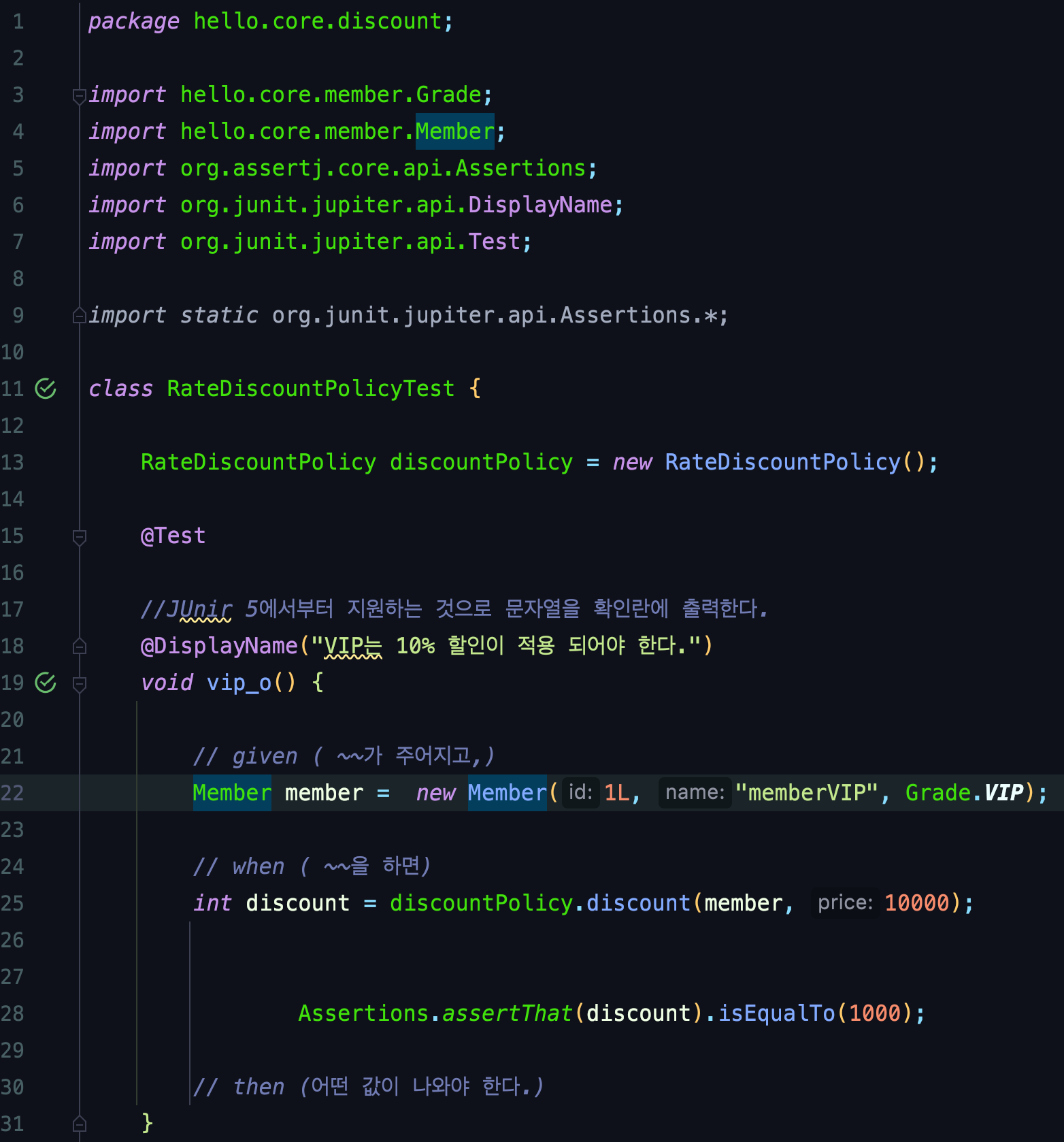 ์ด Method๋ DiscountPolicy๋ฅผ ๊ตฌํํ๋ ๊ตฌํ์ฒด์ด๊ณ , ๊ตฌ์ฒดํ๋ discount์ธ ๊ฒ์ด์์.