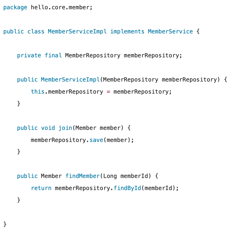 'MemberServiceImpl' ์ ์ฅ์์ ์์ฑ์๋ฅผ ํตํด ์ด๋ค ๊ตฌํ ๊ฐ์ฒด๊ฐ ๋ค์ด์ฌ์ง(์ฃผ์ ๋ ์ง)๋ ์ ์ ์๋ ๊ฒ์ด์์.