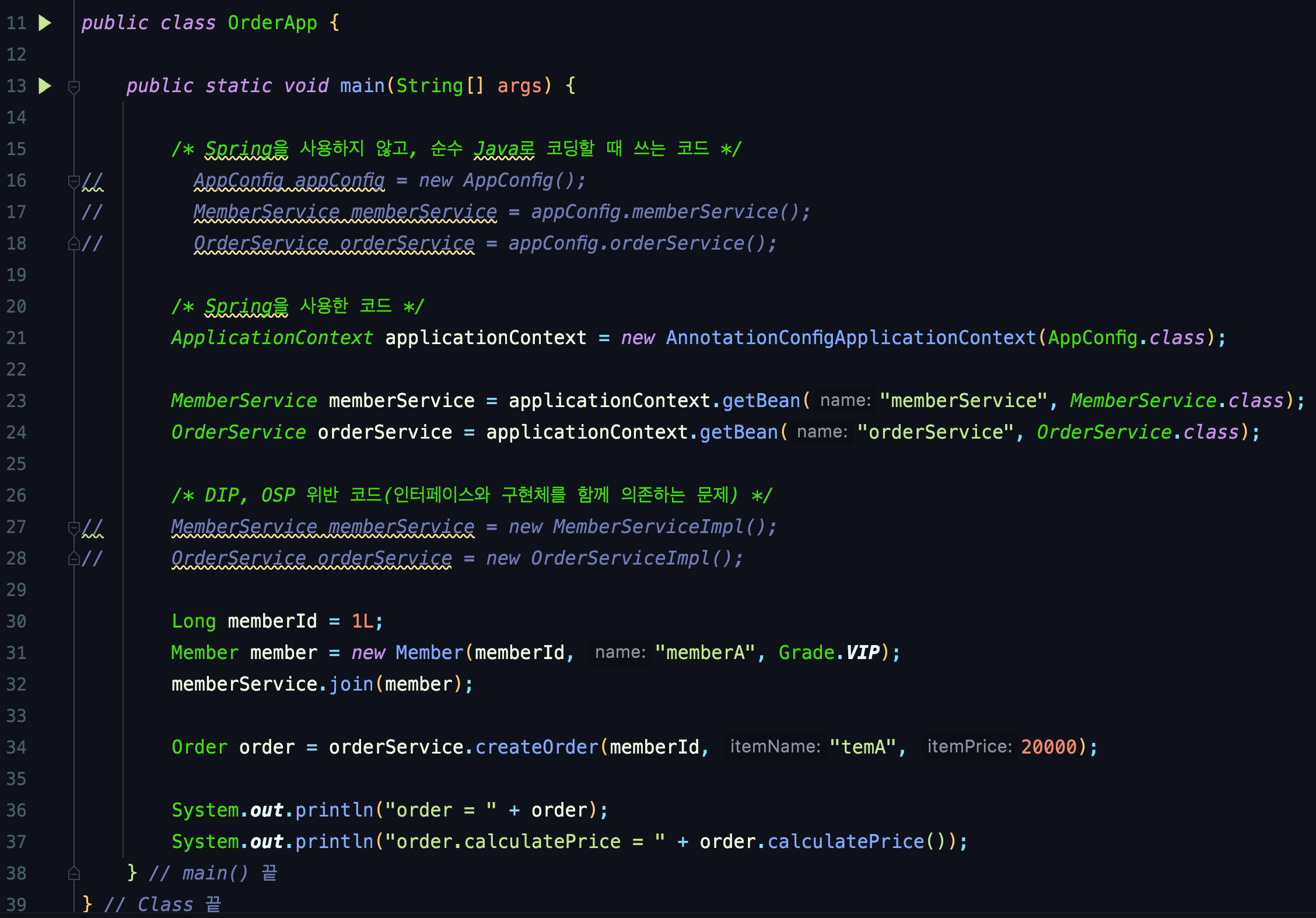 DIP: ์ฃผ๋ฌธ ์๋น์ค ํด๋ผ์ด์ธํธ(OrderServiceImpl)์ DiscountPolicy Interface์ ์์กดํ๋ฉด์ DIP๋ฅผ ์งํค์ง ์์๋์?
