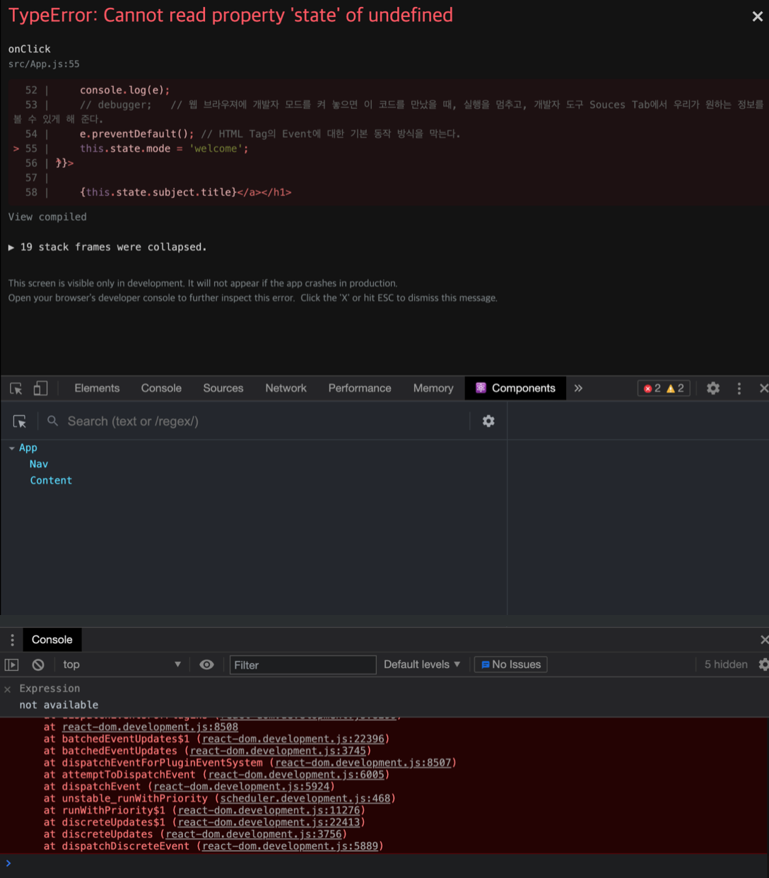 ์ฒซ๋ฒ์งธ : Event๊ฐ ์คํ ๋์์ ๋, ํธ์ถ๋๋ ํจ์ ์์์๋ this์ ๊ฐ์ด ์ปดํฌ๋ํธ ์๊ธฐ ์์ ์ ๊ฐ๋ฅดํค์ง ์๊ณ , ์๋ฌด๊ฒ๋ ์ค์ ๋์ด ์์ง ์๊ธฐ ๋๋ฌธ์ undefind State๋ฅผ ์ฝ์ผ๋ ค๊ณ ํ๋ ์๋ฌด๊ฒ๋ ์๊ธฐ์ Error๊ฐ ๋๋ ๊ฒ์ด์์.
