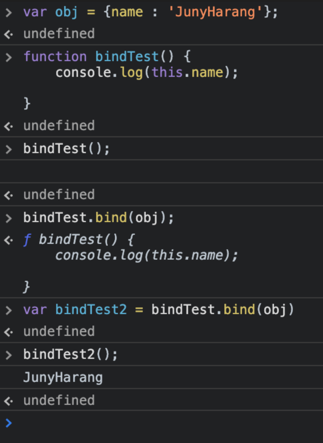 ์์ ๊ฐ์ ๋, var bindTest2๋ bindTest.bind(obj)๋ก ์ธํด console.logd์ this๊ฐ์ด obj๋ก ๋ฐ๋๊ฒ ๋๋ฏ๋ก, bindTest()๊ฐ ํธ์ถ๋ ๋ console.log์ this๋ obj๊ฐ ๋๊ณ , ์ด๋ฆ์ 'JunyHarang'์ผ๋ก ๋์ด ์๊ธฐ ๋๋ฌธ์ ์ถ๋ ฅ๋๋ ๊ฒ์ด์์.