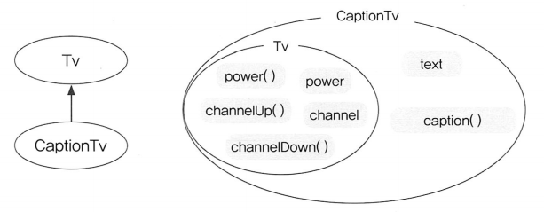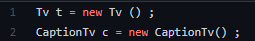 CaptionTv Classμλ textμ caption()μ΄ μ μλμ΄ μκΈ° λλ¬Έμ μ°Έμ‘° λ³μ cλ‘λ c.text, c.caption()κ³Ό κ°μ λ°©μμΌλ‘ cκ° μ°Έμ‘°νκ³ μλ μΈμ€ν΄μ€μμ textμ caption()μ μ¬μ©νλ € ν μ μμ§λ§, cκ° μ°Έμ‘°νκ³ μλ μΈμ€ν΄μ€λ Tv μλ£ν νμ μ΄κ³ , Tv μλ£ν νμ μ μΈμ€ν΄μ€μλ textμ caption()μ΄ μκΈ° λλ¬Έμ μ΄λ κ² μ¬μ©νλ €κ³ νλ©΄ Compile Errorκ° λλ κ²μ΄μμ.