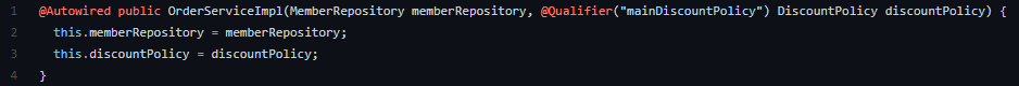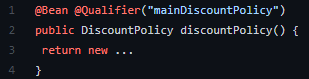 ๊ทธ๋ ๊ฒ ๋๋ฉด mainDiscountPolicy๋ผ๋ ์ด๋ฆ์ ์คํ๋ง ๋น์ ์ถ๊ฐ๋ก ์ฐพ๋ ๊ฒ์ด์์.
