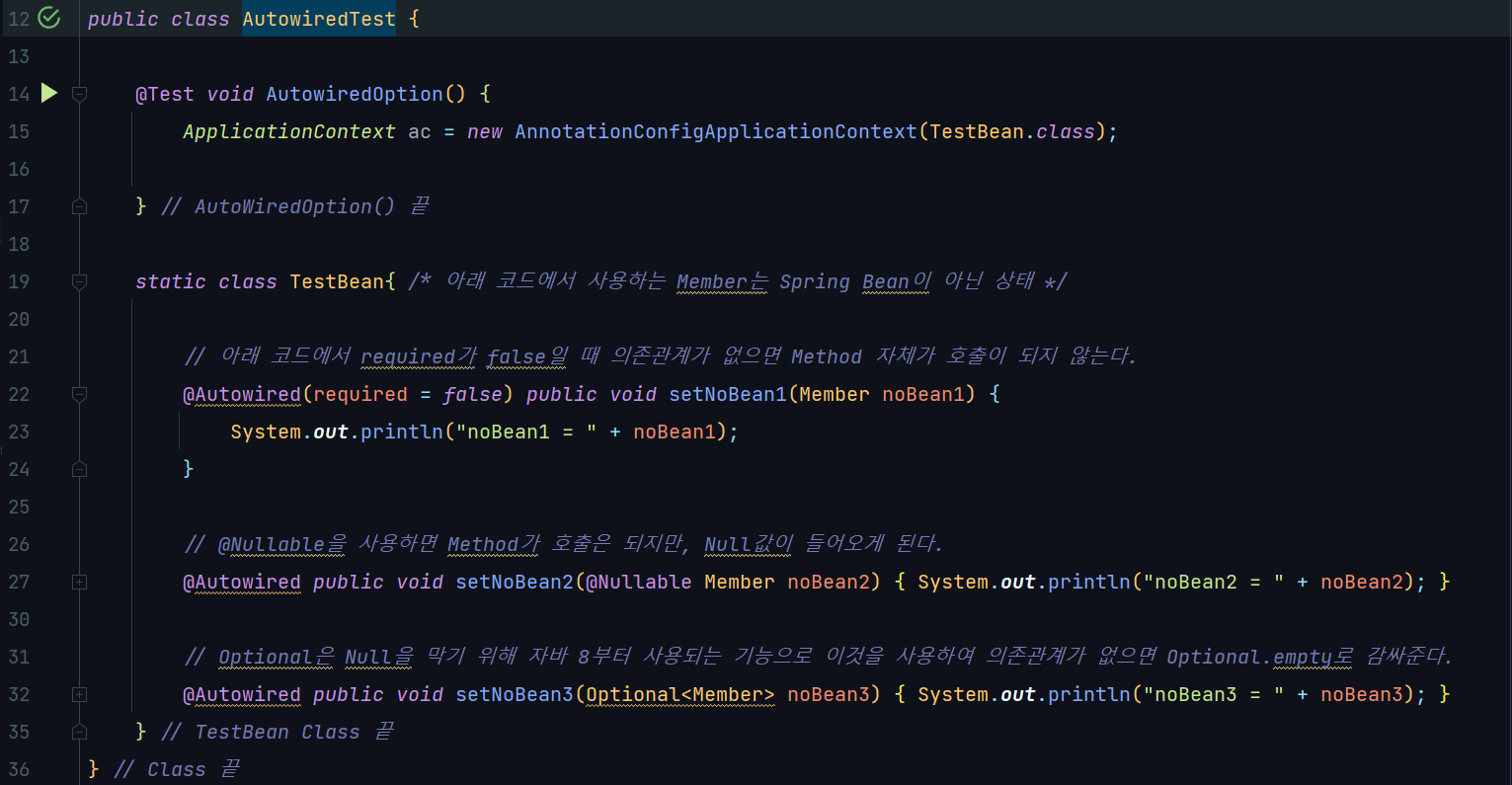 - @Autowired(required=false) : ์์กด ๊ด๊ณ ์๋ ์ฃผ์ ํ ๋์์ด ์์ ๊ฒฝ์ฐ Setter ์์ฒด๊ฐ ํธ์ถ๋์ง ์๋๋ค.