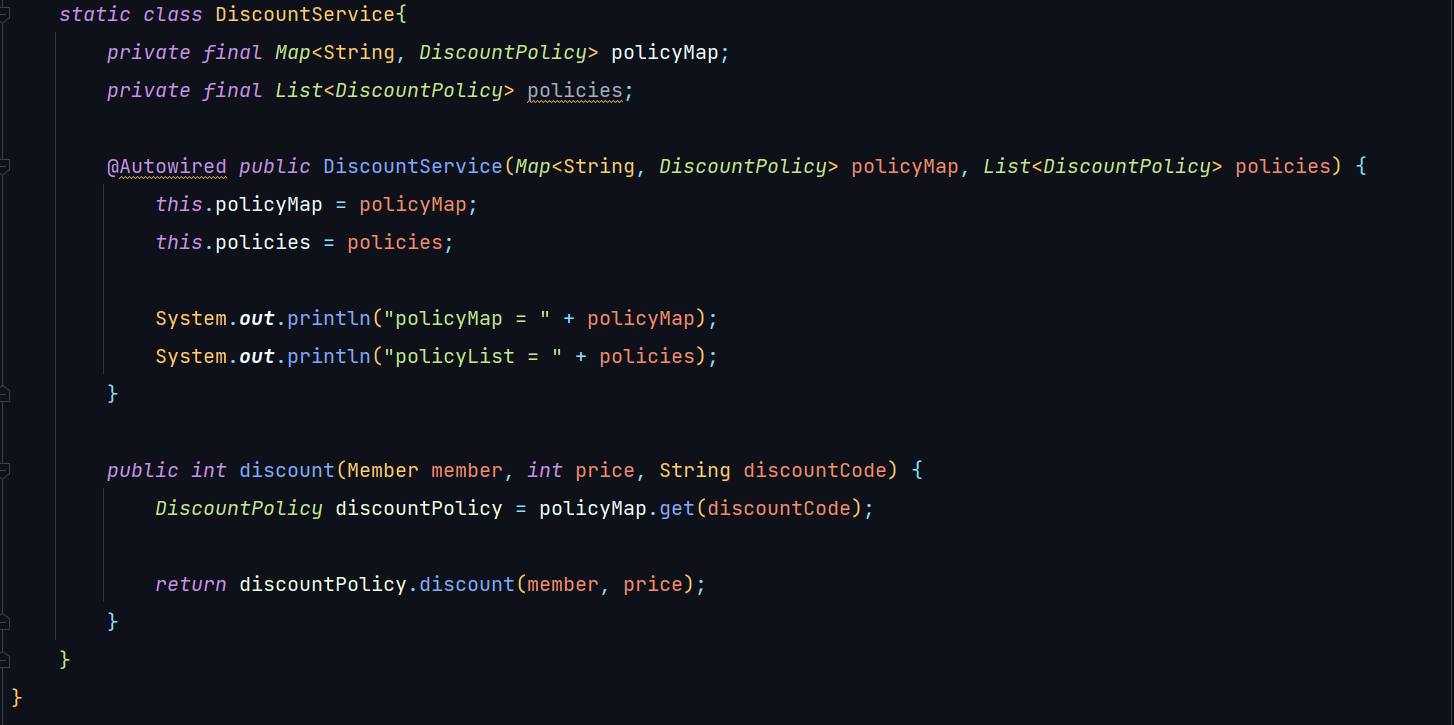 ์์ ์ฝ๋๋ฅผ ์ดํด๋ณด๋ฉด DiscountService๋ Map์ผ๋ก ๋ชจ๋ DiscountOPolicy๋ฅผ ์ฃผ์ ๋ฐ๋ ๊ฒ์ด์์.