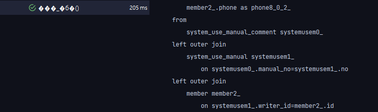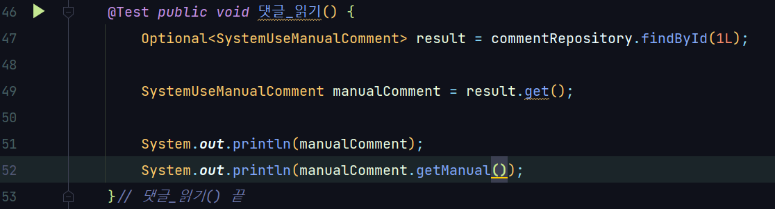 ์ง์ฐ ๋ก๋ฉ ๋ฐฉ์์ผ๋ก ๋ก๋ฉํ๊ธฐ ๋๋ฌธ์ UseManual Table๋ง ๊ฐ์ ธ์์ System.out.println()์ ํ๋ ๊ฒ์ ๋ฌธ์ ๊ฐ ์์ง๋ง,