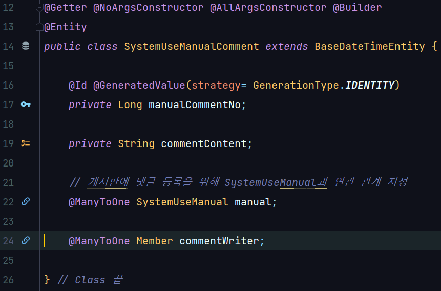 ์ฃผ๋ํ๋์ ํ์ฌ ํด๋น ๊ฒ์ํ์ ๋๊ธ ๊ธฐ๋ฅ๋ ๋ฃ๊ธฐ ์ํด ๋ฐ๋ก Entity๋ฅผ ๋ถ๋ฆฌํ ๊ฒ์ด์์.