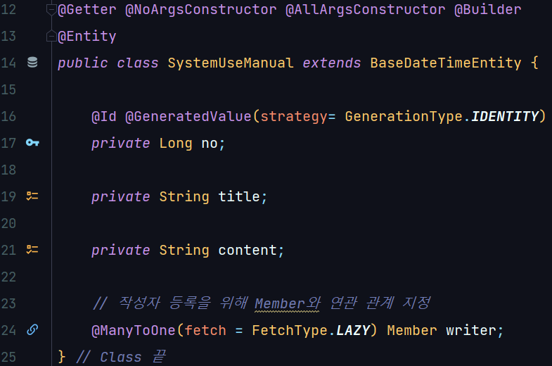 ๊ทผ๋ฐ ์ฌ๊ธฐ์ ์ ๊ฐ ์ ๋ชป ํ๋จํ ๊ฒ์ด ์๋ ๊ฒ์ด์์. ์์ Code๋ฅผ ๋ณด๋ฉด ๊ฒ์ํ๊ณผ์ ์ฐ๊ด ๊ด๊ณ๋ฅผ ์ํด @ManyToOne์ ์ฐ๊ณ , ๋๊ธ ์์ฑ์๊ฐ ํ์ํ๋๊น ๋น์ฐํ Member Table๊ณผ ๋ ์ฐ๊ด๊ด๊ณ๋ฅผ ๋งบ์ด์ค์ผ ํ๋์ง ์ ๊ฒ์ด์์.