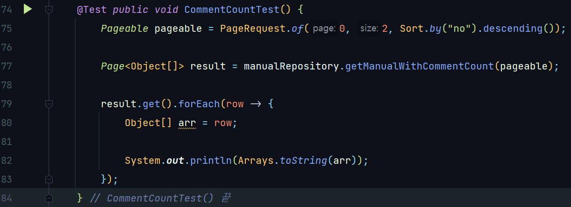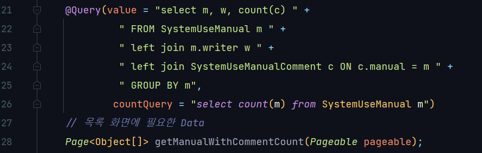 SystemUseManualRepositoryμλ Pageableμ λ§€κ° λ³μλ‘ μ λ¬λ°κ³ , Page<Object[]> λ°ν νμ μ getManualWithCommentCount()λ₯Ό μλμ κ°μ΄ μμ±ν΄ λ³Ό κ²μ΄μμ.