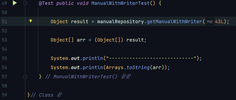 getManualWithWriter() λ SystemUseManual λ₯Ό μ¬μ©νκ³ μμΌλ, Member λ₯Ό κ°μ΄ μ‘°νν΄μΌ νλ μν©μΈ κ²μ΄μμ. SystemUseManual ν΄λμ€μλ Memberμμ μ°κ΄ κ΄κ³λ₯Ό λ§Ίκ³ μκΈ° λλ¬Έμ m.writerμ κ°μ ννλ‘ μ¬μ©ν΄μΌ νλ κ²μ΄μμ. μ΄μ²λΌ λ΄λΆμ μν°ν°λ₯Ό μ΄μ©ν λλ 'LEFT JOIN' λ€μ 'ON'μ μ΄μ©νλ λΆλΆμ΄ μλ κ²μ΄μμ. μμ±ν getManualWithWriter()λ₯Ό ν μ€νΈ μ½λλ‘ νμΈ ν΄ λ³Όκ²μ!