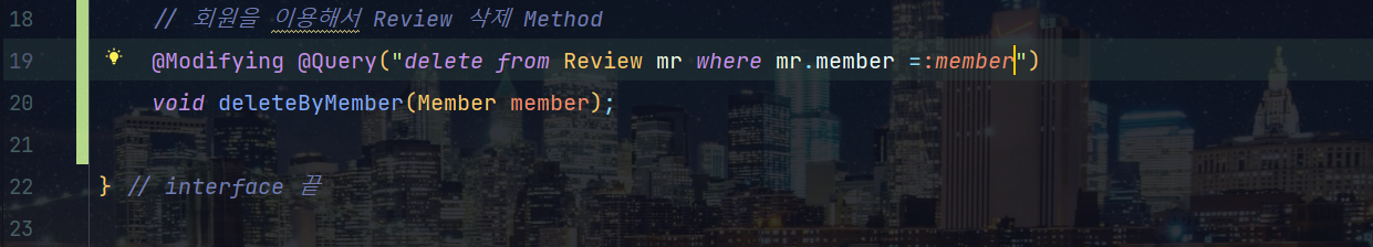 ์ด๊ฒ ๋ํ ๋นํจ์จ์ ์ด๊ธฐ ๋๋ฌธ์ ReviewRepository์์ @Query๋ฅผ ์ด์ฉํ์ฌ where์ ์ ์ง์ ํ๋ ๊ฒ์ผ๋ก ๋์ฒด ํ๋๋ก ํ ๊ฒ์ด์์. (update, delete๋ฅผ ์ด์ฉํ๊ธฐ ์ํด์๋ @Modifying์ด ๋ฐ๋์ ํ์ํ๋ค๋ ๊ฒ ์์ง ๋ง์๊ธฐ ๋ฐ๋ผ๋ ๊ฒ์ด์์.)