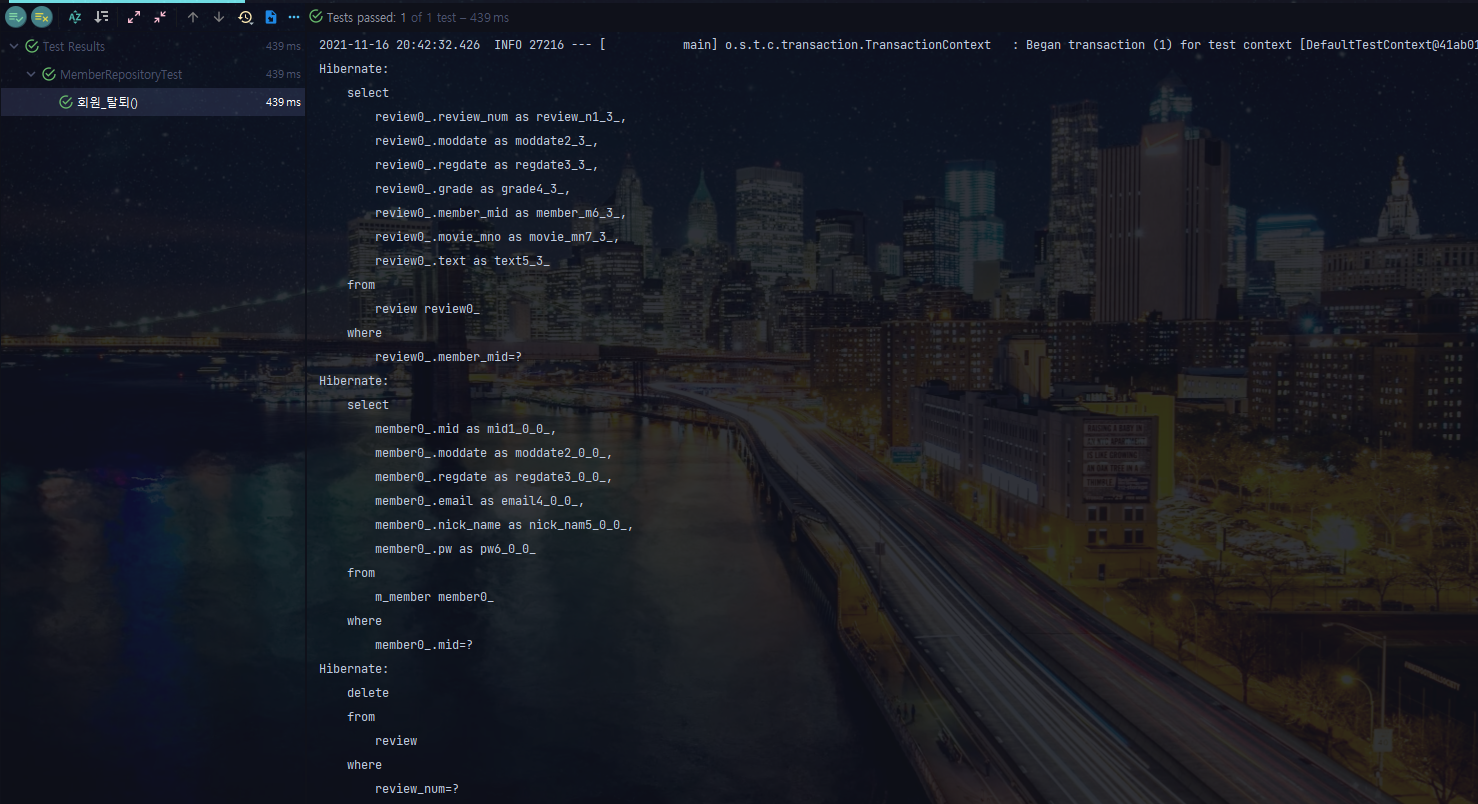 2021-11-16 20:42:32.851 INFO 27216 --- [ main] o.s.t.c.transaction.TransactionContext : Committed transaction for test: [DefaultTestContext@41ab013 testClass = MemberRepositoryTest, testInstance = org.study.junyharang.repository.MemberRepositoryTest@486bcaa, testMethod = ํ์_ํํด@MemberRepositoryTest, testException = [null], mergedContextConfiguration = [WebMergedContextConfiguration@14bee915 testClass = MemberRepositoryTest, locations = '{}', classes = '{class org.study.junyharang.DemoApplication}', contextInitializerClasses = '[]', activeProfiles = '{}', propertySourceLocations = '{}', propertySourceProperties = '{org.springframework.boot.test.context.SpringBootTestContextBootstrapper=true}', contextCustomizers = set[org.springframework.boot.test.autoconfigure.actuate.metrics.MetricsExportContextCustomizerFactory$DisableMetricExportContextCustomizer@61d6015a, org.springframework.boot.test.autoconfigure.properties.PropertyMappingContextCustomizer@0, org.springframework.boot.test.autoconfigure.web.servlet.WebDriverContextCustomizerFactory$Customizer@2abf4075, org.springframework.boot.test.context.filter.ExcludeFilterContextCustomizer@1f97cf0d, org.springframework.boot.test.json.DuplicateJsonObjectContextCustomizerFactory$DuplicateJsonObjectContextCustomizer@26275bef, org.springframework.boot.test.mock.mockito.MockitoContextCustomizer@0, org.springframework.boot.test.web.client.TestRestTemplateContextCustomizer@11bd0f3b, org.springframework.boot.test.context.SpringBootTestArgs@1, org.springframework.boot.test.context.SpringBootTestWebEnvironment@7f690630], resourceBasePath = 'src/main/webapp', contextLoader = 'org.springframework.boot.test.context.SpringBootContextLoader', parent = [null]], attributes = map['org.springframework.test.context.web.ServletTestExecutionListener.activateListener' -> true, 'org.springframework.test.context.web.ServletTestExecutionListener.populatedRequestContextHolder' -> true, 'org.springframework.test.context.web.ServletTestExecutionListener.resetRequestContextHolder' -> true, 'org.springframework.test.context.event.ApplicationEventsTestExecutionListener.recordApplicationEvents' -> false]]