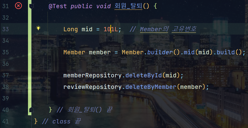 - FK๋ฅผ ๊ฐ์ง๋ Review์ชฝ์ ๋จผ์ ์ญ์ ํ์ง ์๊ณ , Member๋ฅผ ๋จผ์ ์ญ์ ํ๋ ค๊ณ ํ๋ค.