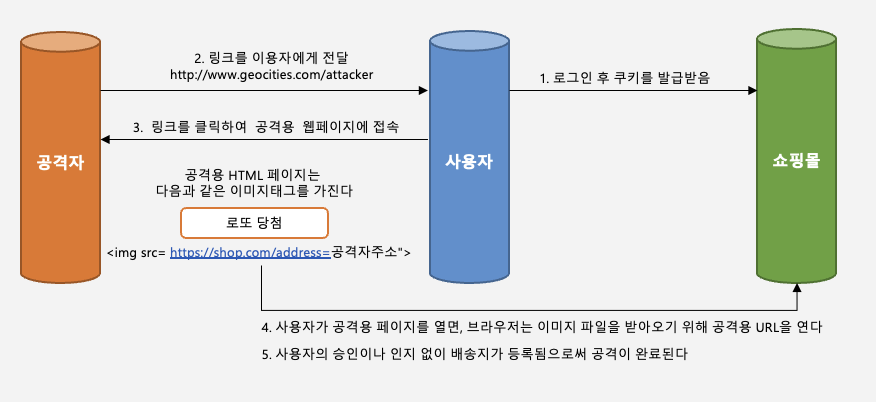 ํ์ฌ ์ํฉ์ ์ด์ฉ์๊ฐ ํ ๋ธ๋ผ์ฐ์ ๋ฅผ ํตํด ์ผํ๋ชฐ์ ์ ์์ด ๋์ด ์๊ณ , ์ด์ฉ์ ๋ธ๋ผ์ฐ์ ์๋ ์ผํ๋ชฐ์ด ๋ฐ๊ธํ Session Cookie๊ฐ ์ ์ฅ๋์ด ์๋ ์ํ์์. ๊ทธ ๋ธ๋ผ์ฐ์ ์์ ๊ณต๊ฒฉ์์ Link๋ฅผ Clickํ์ฌ Image ํ์ผ์ ๋ฐ์ ์ค๊ธฐ ์ํด ์ผํ๋ชฐ URL ๋ค์ [/address=๊ณต๊ฒฉ์๊ฐ ์ํ๋ ํ๋]๊ฐ ์ ํ URL๋ก ์ด๋ํ๊ฒ ๋์ด ์๋ ์ํฉ์ด์์. ์ฆ, ์ผํ๋ชฐ์์ ๋ฐ๊ธ ๋ฐ์ Session Cookie๋ฅผ ๊ฐ์ง๊ณ , ๋ค์ ์์ฒญ์ ๋ณด๋ด๊ฒ ๋ฉ๋๋ค.