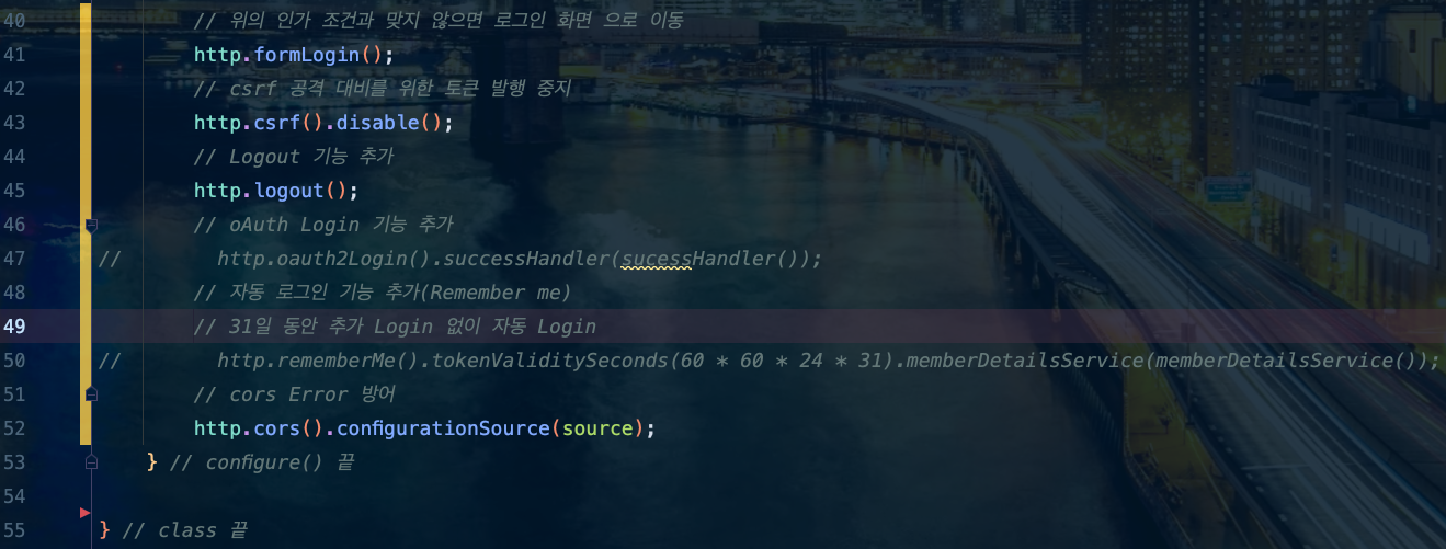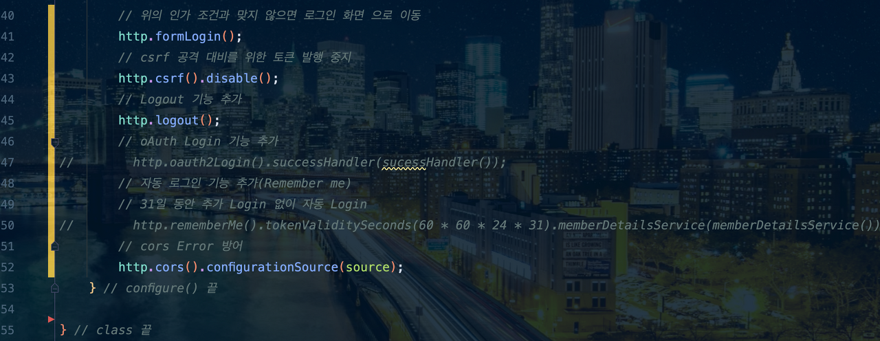 ๋ง์ง๋ง์ผ๋ก cors().configurationSource๋ ์์์ ์ค์ ํ๋ CORS Error ๋ฐฉ์ด ์ค์ ๋ค์ ํ ๋ฐ ๋ชจ์ CORS Error ๋ฐฉ์ด๋ฅผ ์ํด ์ฌ์ฉํ ๋ถ๋ถ์ธ ๊ฒ์ด์์.