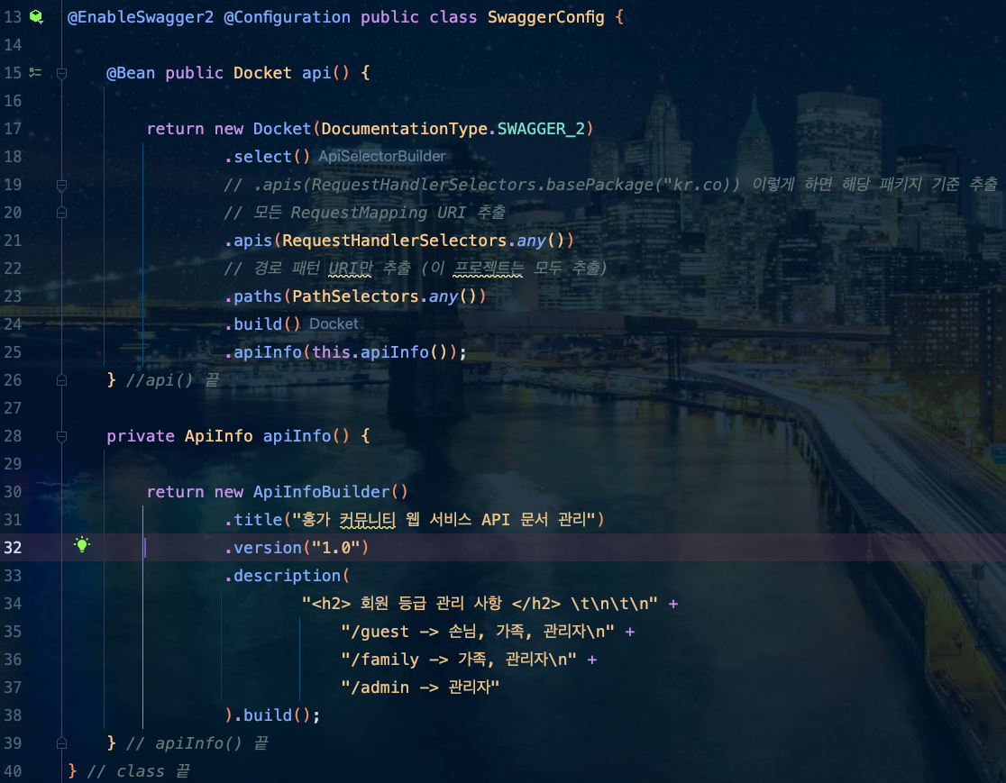 21๋ฒ์งธ Code์ apis์ ๋งค๊ฐ ๋ณ์๋ก RequestHandlerSelectors.basePackage("xx.xx")๋ผ๊ณ ํ๋ฉด ํด๋น ํจํค์ง์ ์๋ ๋ด์ฉ๋ง ๊ฐ์ง๊ณ ์ถ์ถํ์ฌ Swagger ๋ฌธ์๋ฅผ ๋ง๋๋๋ฐ, ์ฃผ๋ํ๋์ ๋ชจ๋ ์ถ์ถ์ ์ํด์ any()๋ผ๊ณ ์ ์ด์ฃผ์์ต๋๋ค.