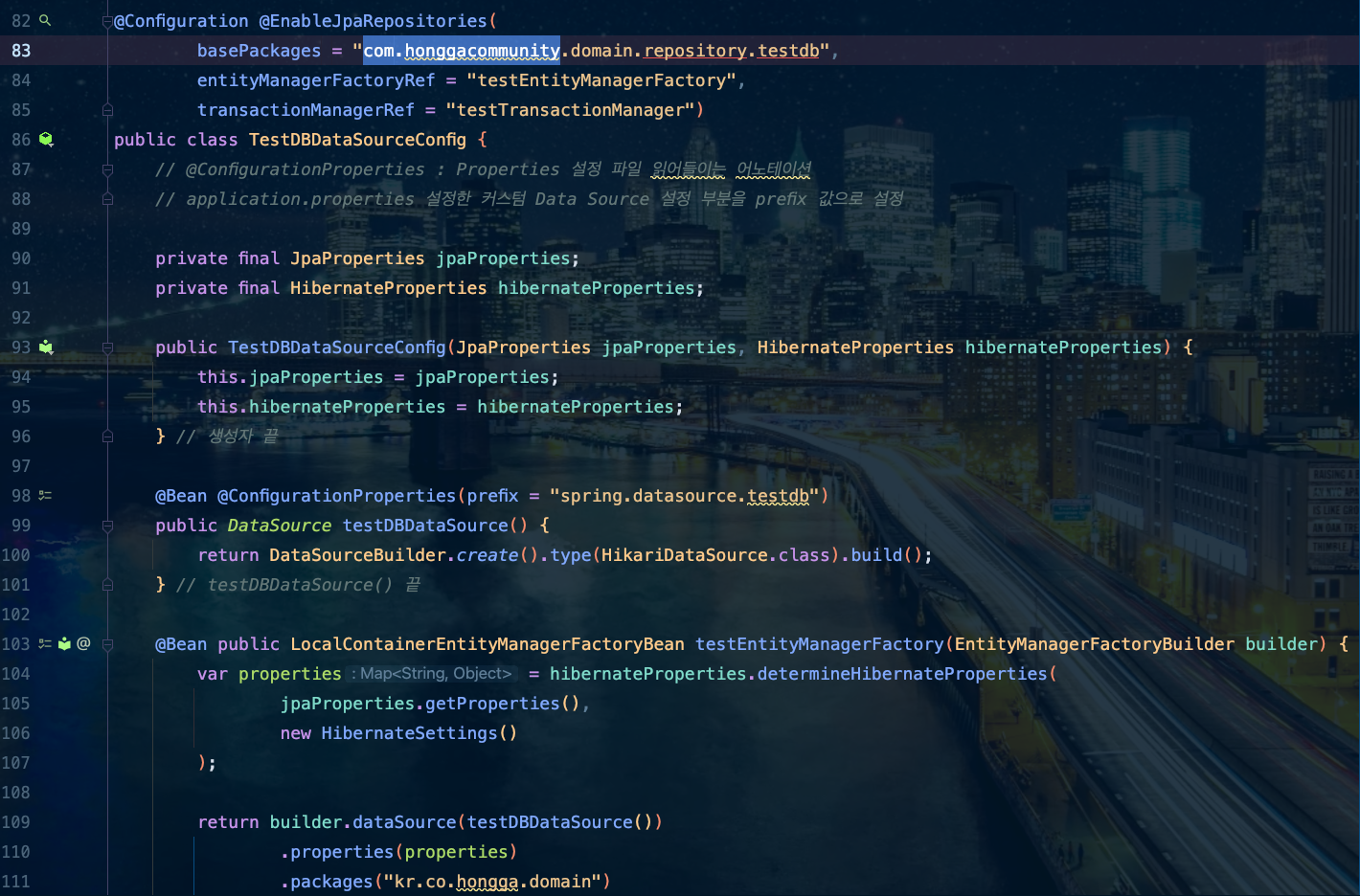 ์์ ์ฝ๋์์ ์ฒ๋ผ Coustom datasource, entityManagerFactory ๋ฑ์ ์ค์ ์ ํ๊ณ , base Packages์ Repository Package Path๋ฅผ ์ ์ด์ฃผ๋ฉด ๋๋ ๊ฒ์ด์์. entityManagerFactory์์๋ Entity์ Package๋ฅผ ์ง์ ํด ์ฃผ๋ฉด ๋๋๋ฐ, ์ฃผ๋ํ๋์ ๋ DB ๋ณ๋ก ๋ค๋ฅด๊ฒ ๊ฐ๊ฐ ์ค์ ์ ํด ์ค ๊ฒ์ด์์.