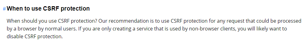 ์ด์ ๋ ๋ฐ๋ก REST API์์ Spring Security Documentation์ Non-browser Clients๋ง์ ์ํ Service๋ผ๋ฉด csrf ๊ธฐ๋ฅ์ disableํ์ฌ๋ ์ข๋ค๊ณ ํ๊ธฐ ๋๋ฌธ์ธ ๊ฒ์ด์์.