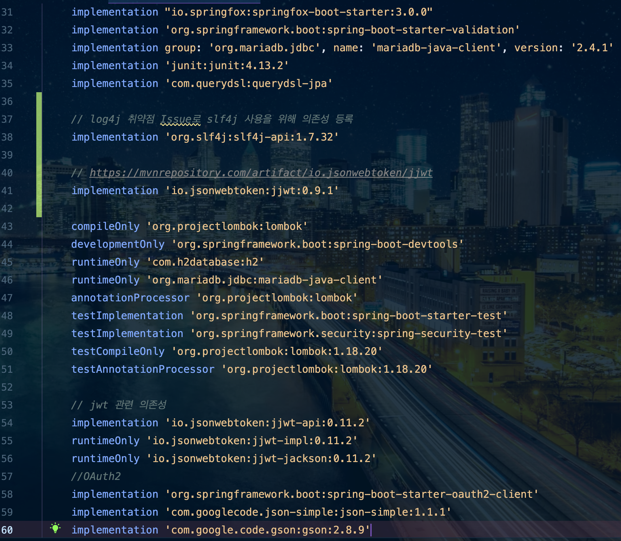 ๊ทธ๋ฆฌ๊ณ , TEST๋ฅผ ํ ๋ ์ฌ์ฉํ JUnit4์ ์์กด์ฑ์ ๋ฐ์๊ณ , jwt๋ฅผ ํตํด ํ ํฐ ๊ธฐ๋ฐ์ ์์ ํ ๋ก๊ทธ์ธ ๊ธฐ๋ฅ์ ๊ตฌํํ๊ธฐ ์ํด ํด๋น ์์กด์ฑ์ ์ถ๊ฐํ ๊ฒ์ด์์.