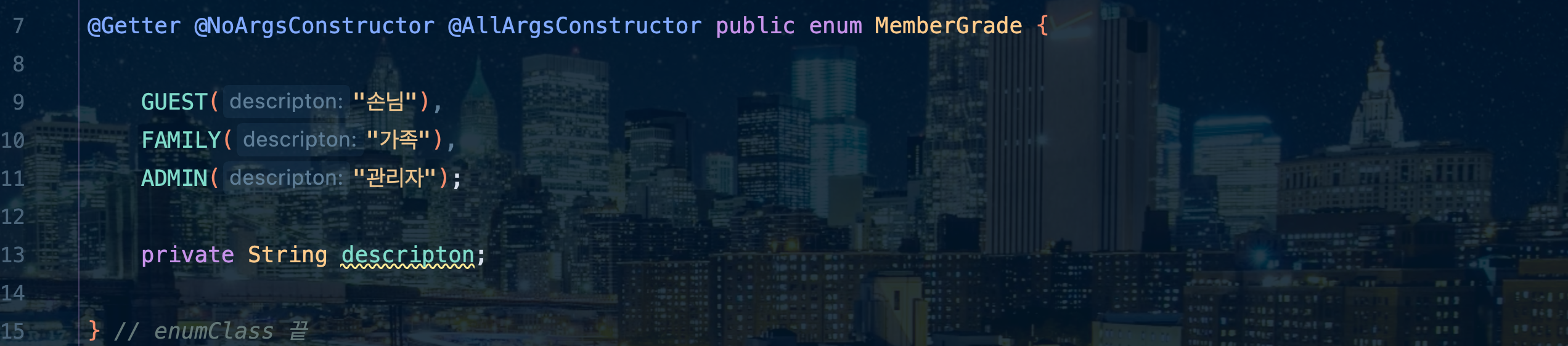 ๊ทธ ๋ค์์ GUEST, FAMILY, ADMIN์ด๋ผ๋ ๋ฑ๊ธ์ ๋๋๊ณ , ํด๋น enum(์ด๊ฑฐํ) ๋ณ๋ก ์ค๋ช