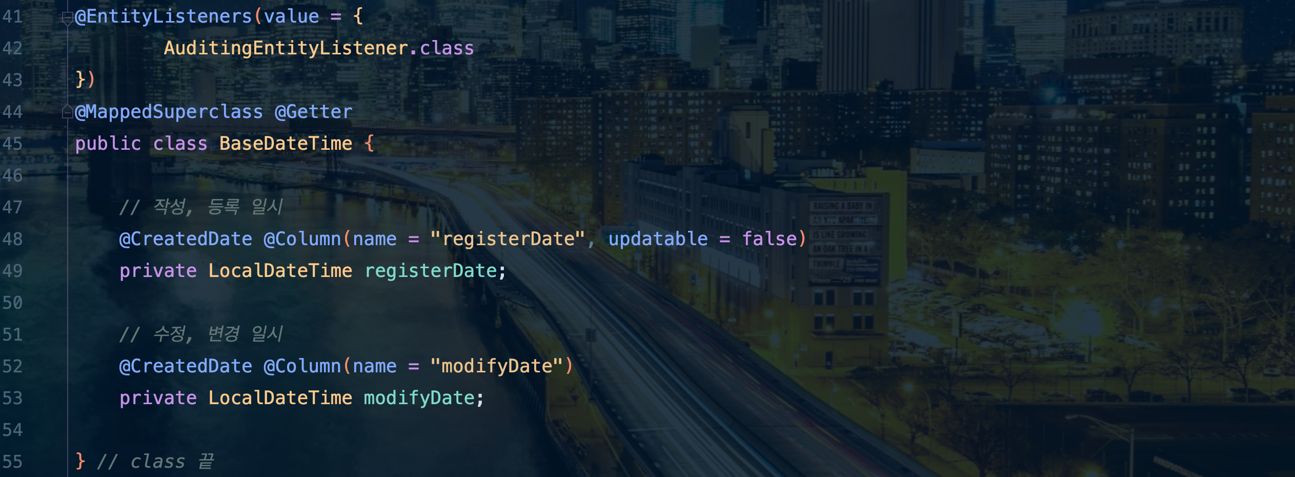 JPA Entity Class๋ค ํด๋น ์ถ์ ํด๋์ค ์์ํ ๊ฒฝ์ฐ registerDate, modifyDate๋ฅผ ์ปฌ๋ผ์ผ๋ก ์ธ์ํ๊ฒ ํด์ฃผ๋ ์น๊ตฌ์ธ ๊ฒ์ด์์.