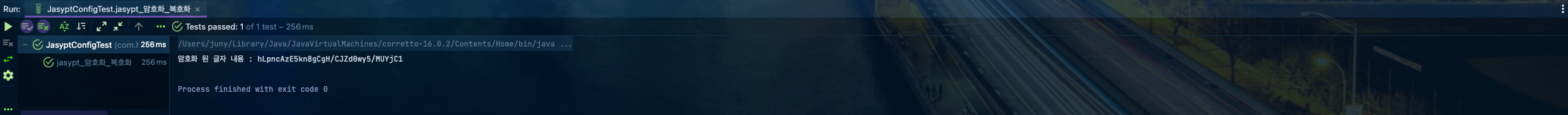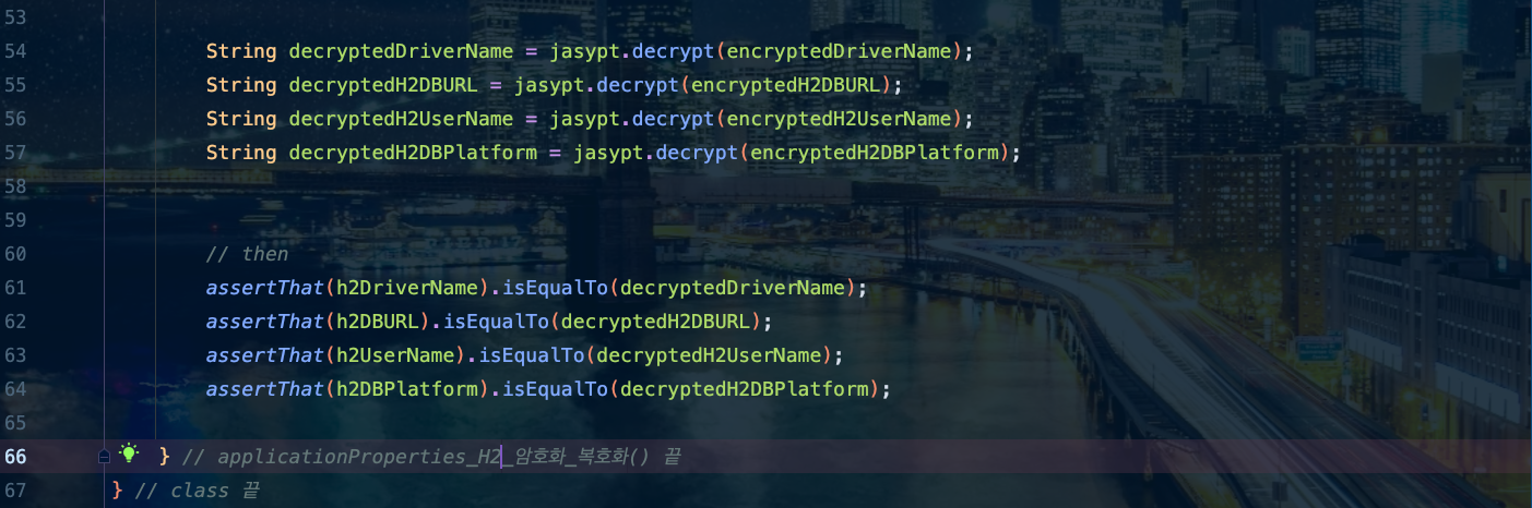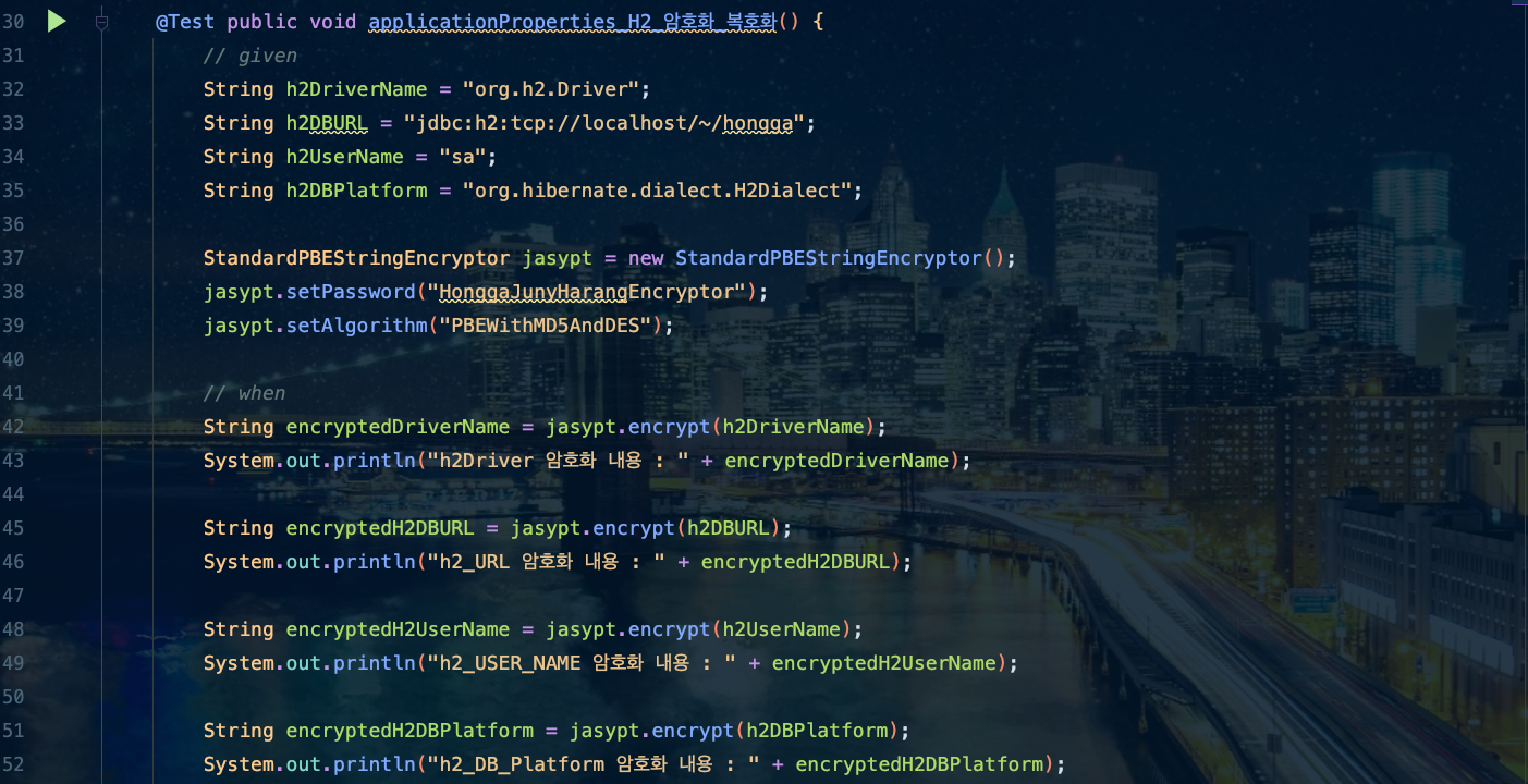 μ΄μ Test Codeλ₯Ό μμ±ν¨μΌλ‘ Encrypt(μνΈν)μ Decrypt(볡νΈν)κ° μ λλμ§ νλ² νμΈ ν΄ λ³Ό κ²μ΄μμ. κ·Έ κ²°κ³Όλ₯Ό ν΅ν΄μ application.propertiesμ μ μ©ν΄ λ³΄λ €κ³ ν©λλ€.