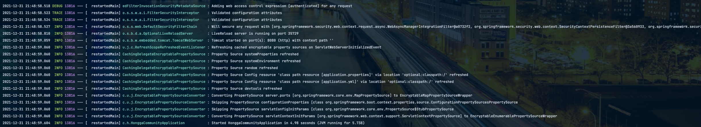 2021-12-31 21:48:59.604 INFO 13816 --- [ restartedMain] c.h.HonggaCommunityApplication : Started HonggaCommunityApplication in 4.98 seconds (JVM running for 5.738)