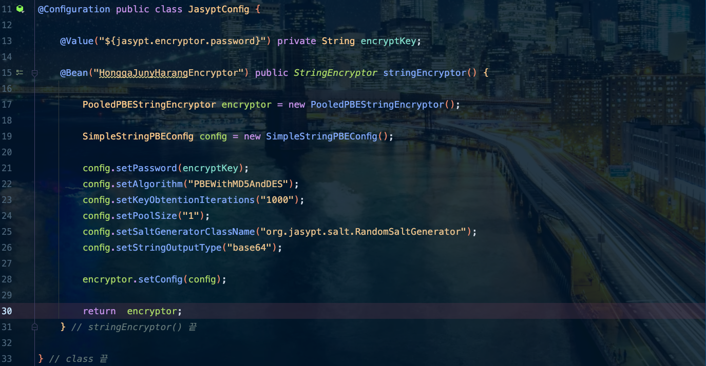 μ΄μ μ€μ μ©μΌλ‘ μ¬μ©ν ClassμΈ 'JasyptConfig'λ₯Ό λ§λ€μ΄ λ³Ό κ²μ΄μμ.