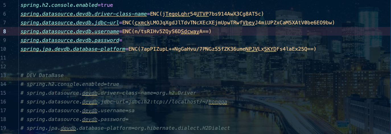 μ΄μ μμ λμ¨ encryptedText κ²°κ³Όκ°μ ENC() λ‘ κ°μΈμ£Όμ΄ application.propertiesμ λν λ΄μ©μ μνΈν ν΄ λ³Ό κ²μ΄μμ. κ·Έλ¬κΈ° μν΄μλ application.propertiesμ μ λ ₯ λμ΄ μλ κ°λ€ μλ₯Ό λ€λ©΄ DBμ URLμ΄λ, username λ±μ κ°μ μ κΈ° encryptedTextμ λ£μ΄μ κ²°κ³Όκ°μ λ£μ΄μ£Όλ©΄ λλ κ²μ΄μμ.