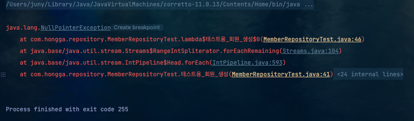 ์์ Test Code๋ฅผ ์คํํ๋ ๋ค์๊ณผ ๊ฐ์ด Null Pointer Exception์ด ๋ฐ์ํ ๊ฒ์ด์์!