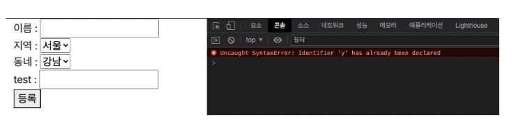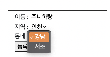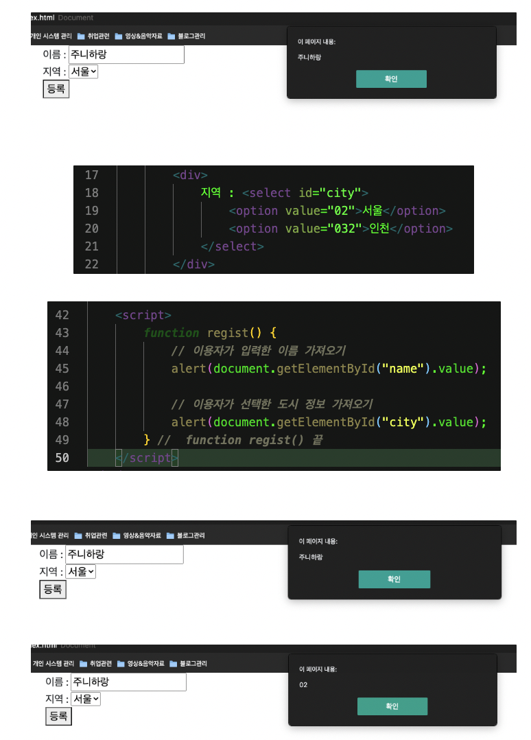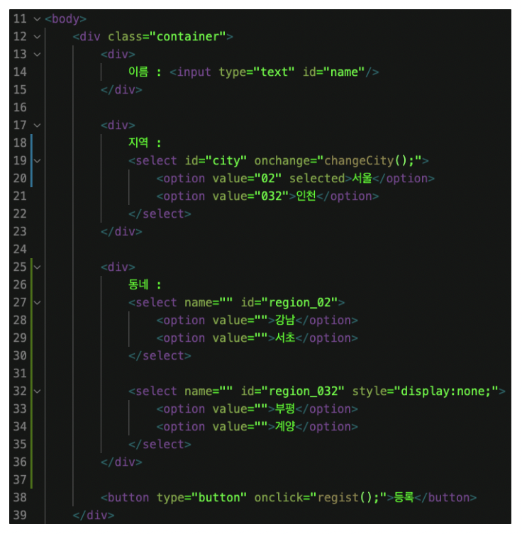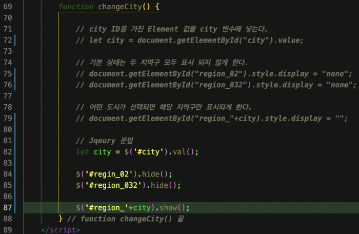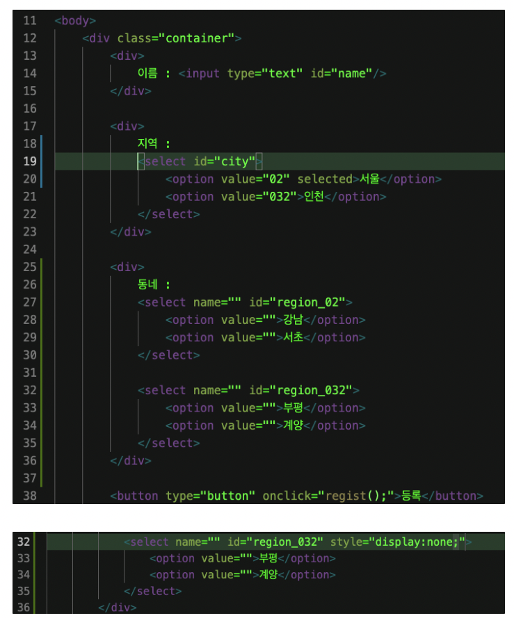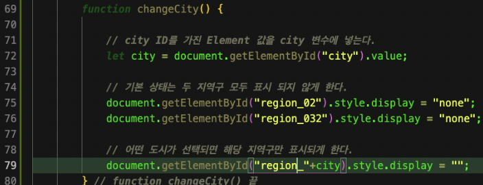 ์ "region_"+city ๋ฅผ ํ์ฌ city๊ฐ ์ ํ์ด ๋์์ ๋ ๊ทธ ๊ฐ์ด city๋ผ๋ ๋ณ์์ ๋ค์ด๊ฐ๊ฒ ๋๊ณ , ๊ทธ ๋ณ์์ ๋ด๊ธด ๊ฐ์ด ์์ธ์ด๋ฉด ‘02’, ์ธ์ฒ์ด๋ฉด ‘032’์ด๋๊น region_ ๋ค์ ํด๋น ๊ฐ์ ๋ถํ์ฃผ๊ณ , ๊ทธ๊ฒ์ style.display = ""; ํ๊ฒ ๋๋ฉด ๋ณด์ด๊ฒ ๋๋ ๊ฒ์ด๋ค.