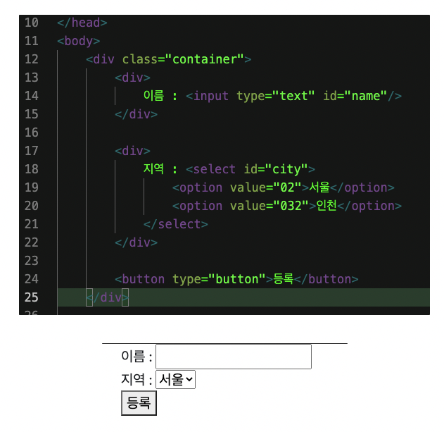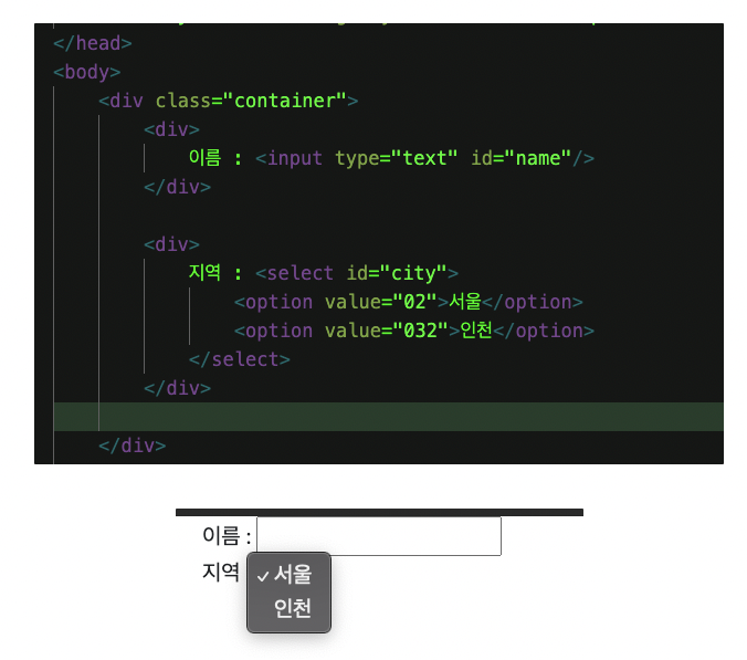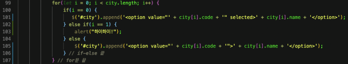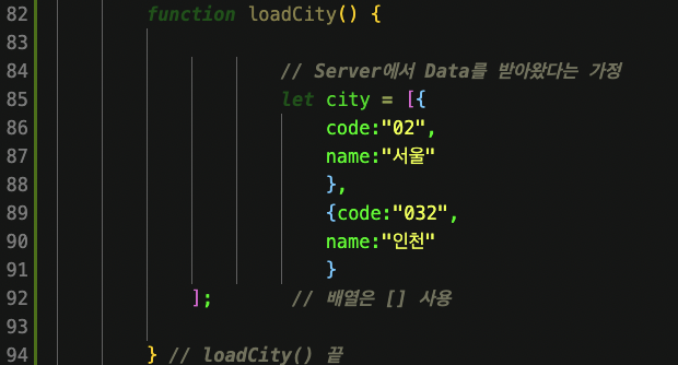 ์์ city[i].code ๋ฅผ ๋ถ์ํด ๋ณด๋ฉด city๋ผ๋ ์ด๋ฆ์ i๋ฒ์งธ ํ์ฌ๋ 0๋ฒ์งธ๋ผ๊ณ ํ๋ฉด ์ฒซ๋ฒ์งธ ์ธ๋ฑ์ค ๊ฐ์ธ code:02, name: ์์ธ ์ธ ๋ด์ฉ์ด๊ณ , ์ฌ๊ธฐ์ .code ๋ ‘02’๊ฐ ๋๋๋ฐ, ์ด๊ฒ์ ์ ํํ๋ผ๋ ๊ฒ์ด๊ณ , ๊ทธ ๋ค์ ๋ด์ฉ์ ์ด๋ฆ (์์ธ)์ select Box ์์ ์ ํ๋๊ฒ ํ๋ ๊ฒ์ด์์.