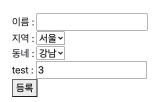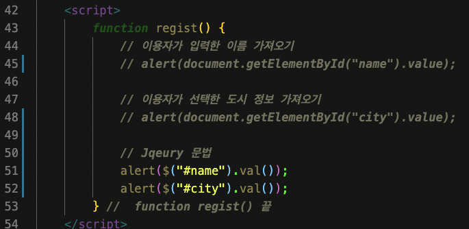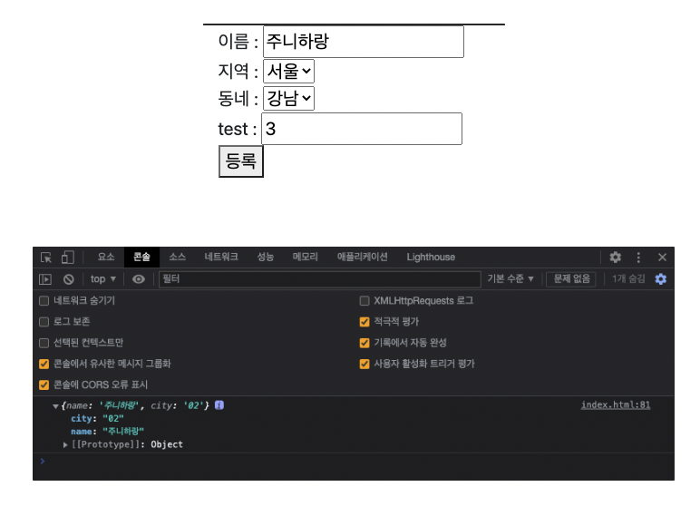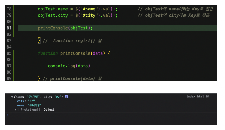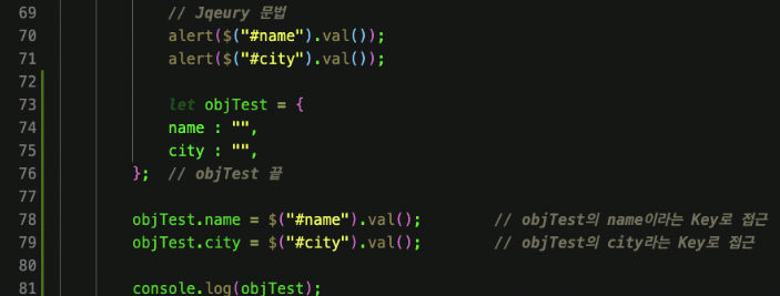 objTest.city = $("#city").val(); // objTest์ city๋ผ๋ Key๋ก ์ ๊ทผ