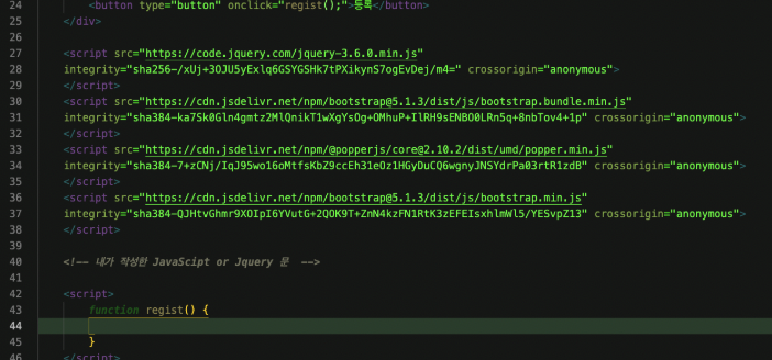 ๋ ฅ๋ ๊ฐ์ ์ฒ๋ฆฌํ๊ธฐ ์ํ ๋ฑ๋ก ์ด๋ผ๋ button์ ์์ฑ ํด ์ค ๊ฒ์ด์์.
