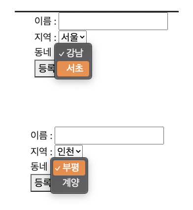 ๋ง์ฝ์ ์ด์ฉ์๊ฐ ‘์ธ์ฒ'์ ์ ํํ์ ๋๋ ์ธ์ฒ์ ํด๋นํ๋ ์ง์ญ๊ตฌ๋ง ์ถ๋ ฅํ๊ณ , ์์ธ์ ์ ํํ์ ๋๋ ์์ธ์ ํด๋นํ๋ ์ง์ญ๊ตฌ๋ง ์ถ๋ ฅ ํ๊ณ ์ถ๋ค๋ฉด?