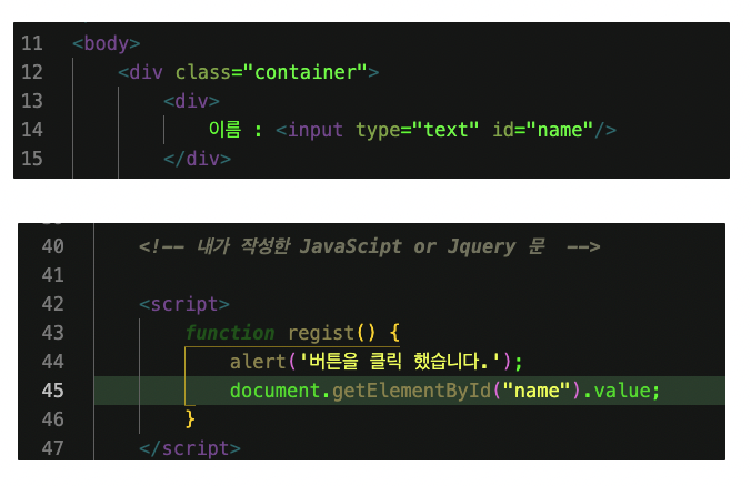 JQuery๋ฅผ ์ฌ์ฉํ๋ฉด ์ด๋ ๊ฒ ๊ฐ๋จํ๊ฒ ์ฌ์ฉ์ ํ ์ ์๋๋ฐ, $๋ฅผ ๋ถ์ฌ์ฃผ๊ณ , #์ ID๋ฅผ ์๋ฏธํ๋ ๊ฒ์ด์์.