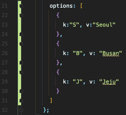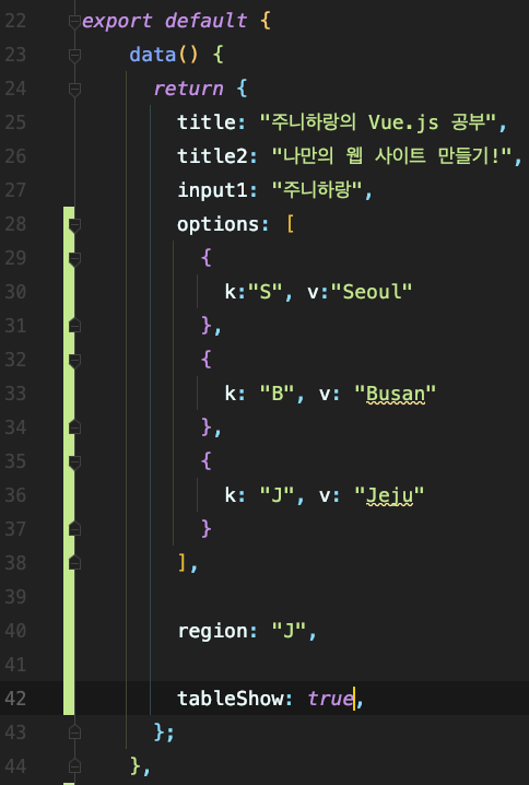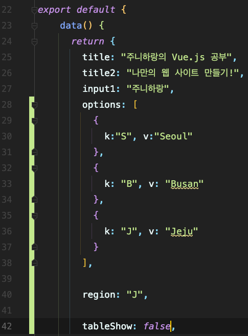 ๋จผ์ data()์ options๋ผ๊ณ ์ ์ธํ๊ณ , Object๊ฐ ์ฌ๋ฌ๊ฐ ๋ค์ด ์๋ ๋ฐฐ์ด์ ๋ง๋ค์ด ์ค ๊ฒ์ด์์.