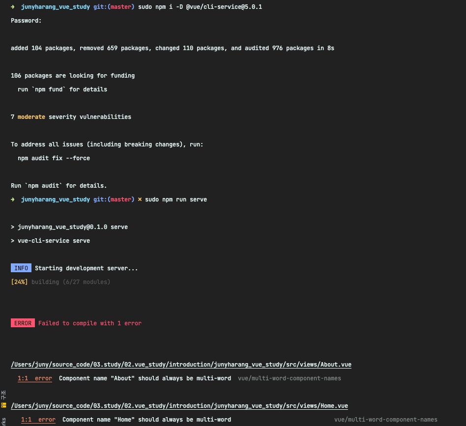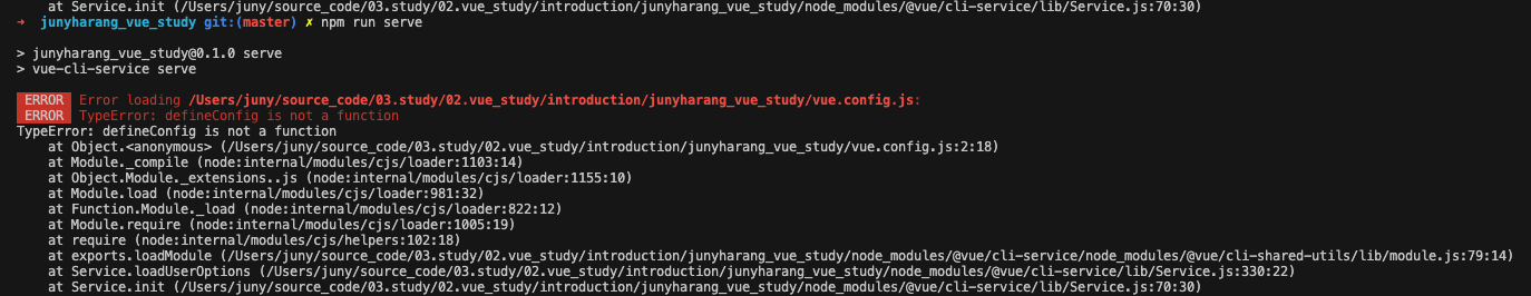์ Error๋ฅผ ๋ง๋๊ณ , ๋ค์๋ ๋ค์ `# npm run serve` ๋ช ๋ น์ด๋ฅผ ์ฃผ๋ ์๋ ์ฒ๋ผ Errror๊ฐ ๋ฐ์ํ ๊ฒ์ด์์.