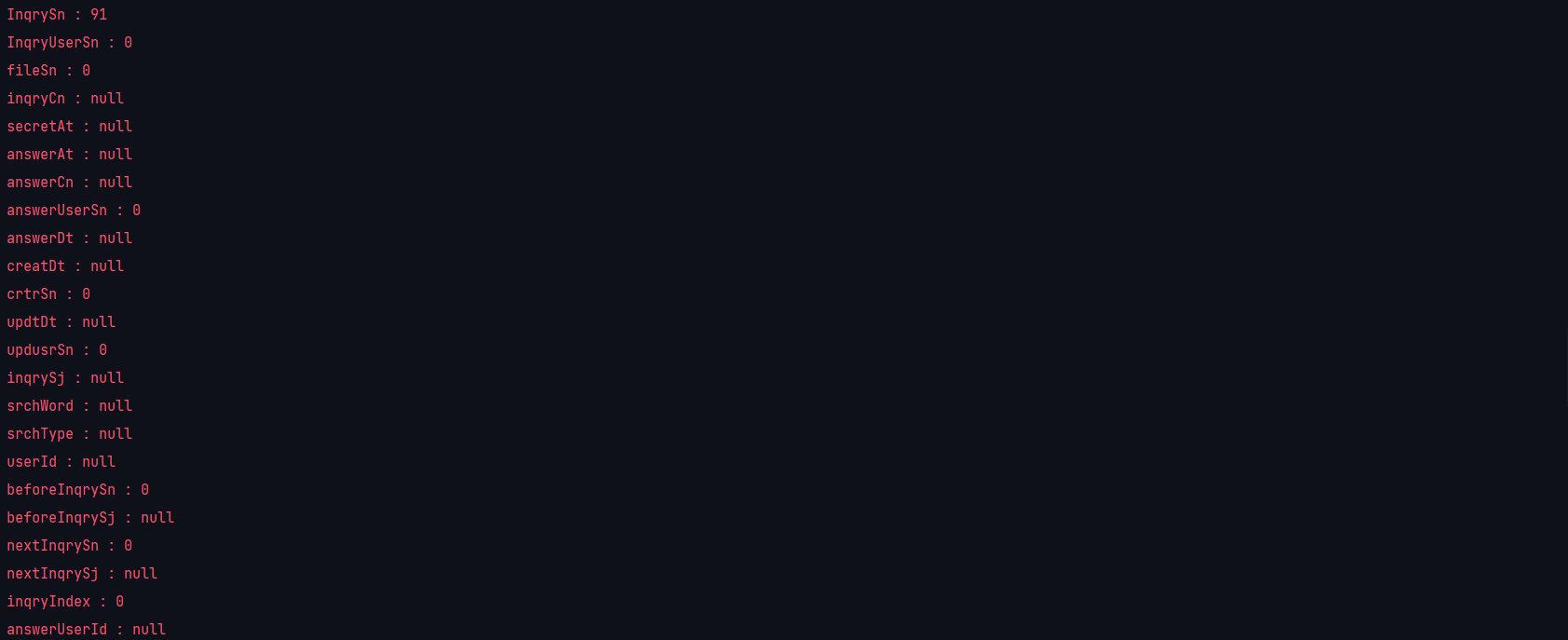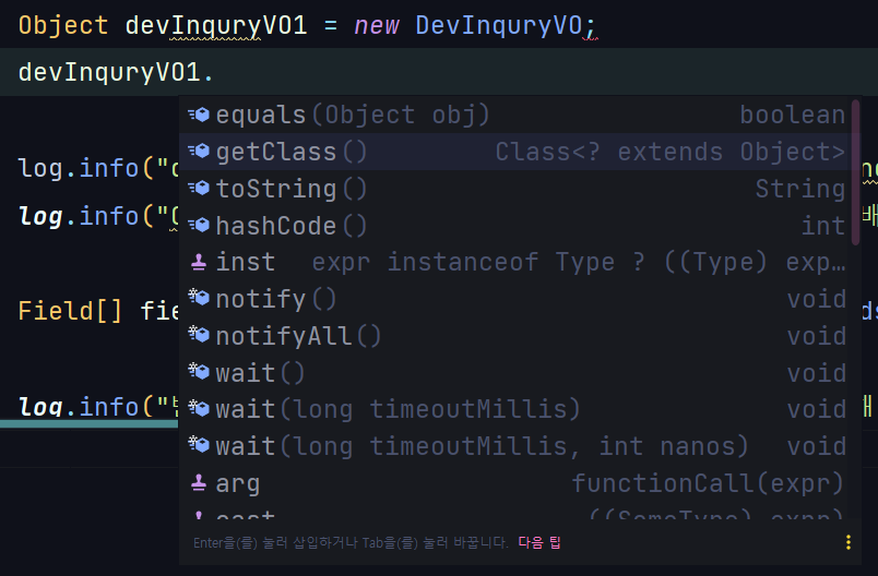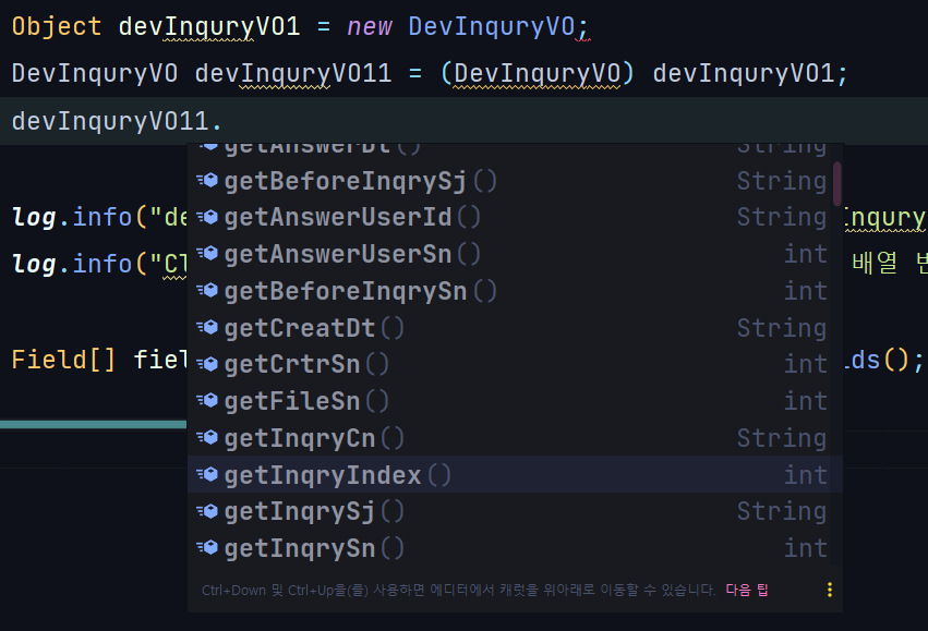 ์๋ฅผ ํ๋ ๋ค์ด ๋ณผ๊ฒ์. ์๋ ์ฒ๋ผ `DevInquryVO`๋ผ๋ Class๊ฐ ์๊ณ , ์ด Class์ ๊ฐ์ฒด๋ฅผ devVO๋ผ๊ณ ํ ๊ฒ์ด์์.