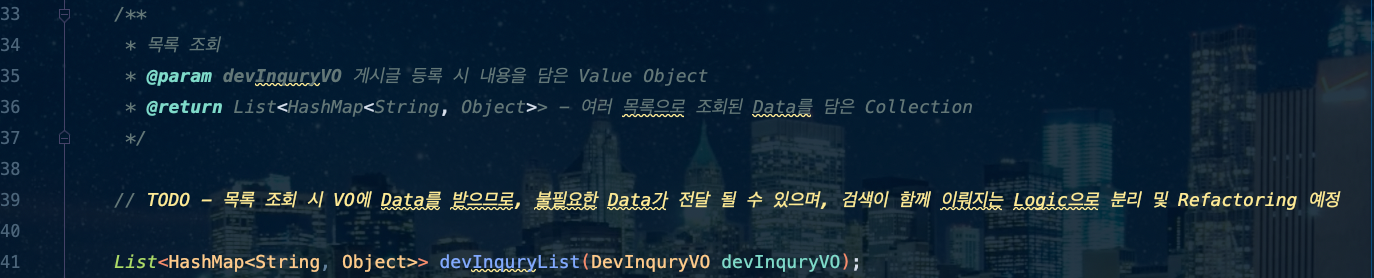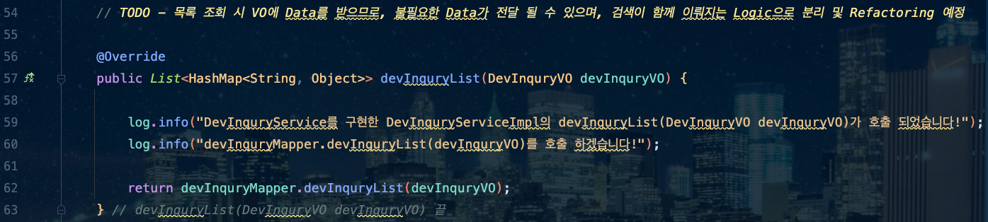 ์ต์ด ๋ชฉ๋ก ์กฐํ๋ผ๋ ๋น์ฆ๋์ค ๋ก์ง ์ฒ๋ฆฌ๋ฅผ ์ํด 169๋ฒ์งธ ์ค์์ Service์ ํด๋น Method๋ฅผ ํธ์ถํ๋ ๊ฒ์ด์์. ๋์ค์ ์์ ๋์ด์ผ ํ ๋ถ๋ถ์ด์ง๋ง, ํ์ฌ๋ ๋งค๊ฐ๋ณ์๋ก VO๋ฅผ ๋ฃ์ด์ฃผ๊ณ ์๋๋ฐ, ์ฐจ ํ ๋ชฉ๋ก ์ฒ๋ฆฌ์ ํ์ํ Paging ๊ด๋ จ ๋งค๊ฐ ๋ณ์๋ง ๋ฃ์ด์ฃผ๋๋ก ๋ฐ๊ฟ ๊ฒ์ด์์.