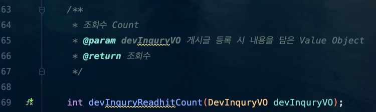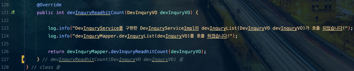 ๊ทธ๋ฐ๋ค 172๋ฒ์งธ ์ค์ ๋ณด๋ฉด ์กฐํ์ Count๋ฅผ ํ๊ธฐ ์ํด Service์ ํด๋น Method๋ฅผ ํธ์ถํ๊ณ ์๋ ๊ฒ์ด์์. ์ด ์ญ์ VO๋ฅผ ๋งค๊ฐ ๋ณ์๋ก ๋ฃ์ด์ฃผ๊ณ ์๋ต๋๋ค.
