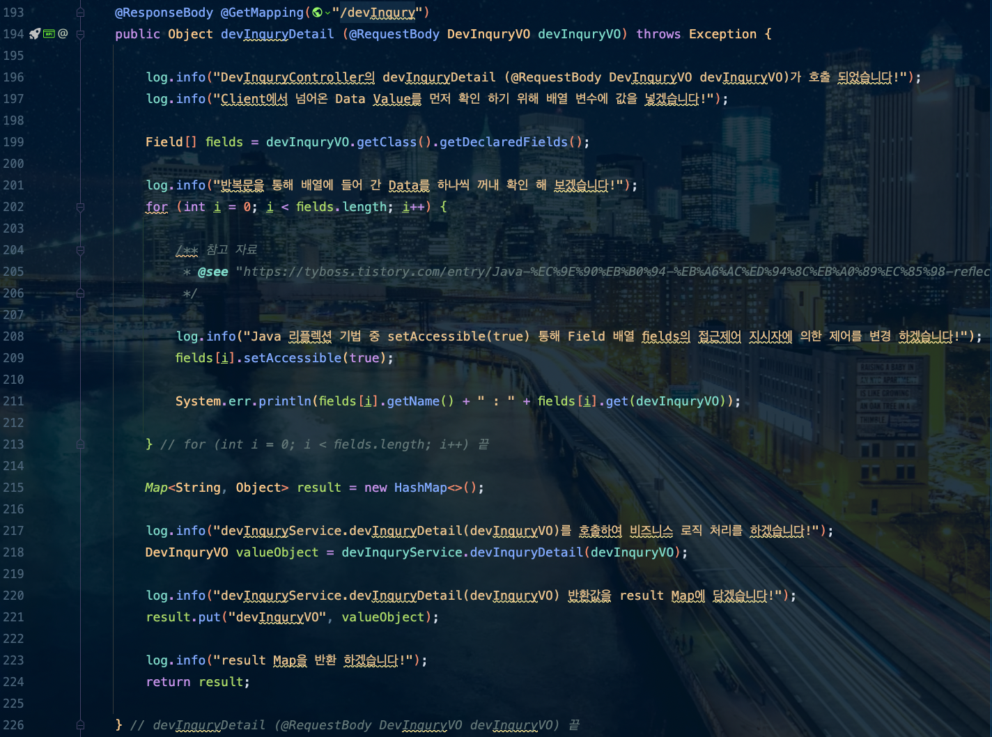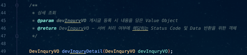 ๊ทธ๋ฆฌ๊ณ , ๊ฒฐ๊ณผ๊ฐ์ด ๋ฐํ๋๋ฉด ํด๋น ๊ฐ์ DevInqryVO ๊ฐ์ฒด ์๋ฃํ Type์ผ๋ก ๋ฐ์์ result์ ๋ด์์ฃผ๋ ๊ฒ์ด์์.