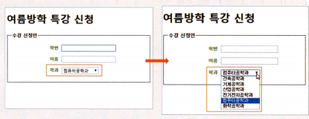 λλ‘λ€μ΄ λͺ©λ‘μ <select> νκ·Έμ <option> νκ·Έλ₯Ό μ΄μ©ν΄ νμνλ κ²μ΄μμ. <select> νκ·Έλ‘ λλ‘λ€μ΄ λͺ©λ‘μ μμκ³Ό λμ νμνκ³ , κ·Έ μμ <option> νκ·Έλ₯Ό μ΄μ©ν΄ μνλ νλͺ©λ€μ μΆκ° λ겨주기 μν κ°μ μ§μ νλ κ²μ΄μμ.