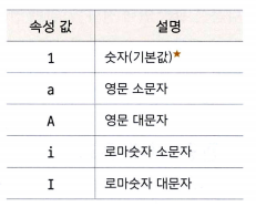 - type μμ± - <ol> νκ·Έλ μμ λͺ©λ‘μ΄κΈ° λλ¬Έμ κ° νλͺ© μμ 1, 2, ... κ°μ μ«μκ° κΈ°λ³ΈμΌλ‘ λΆμλ°, <ol> νκ·Έμ type μμ±μ μ΄μ©ν΄ μ«μμ μ’