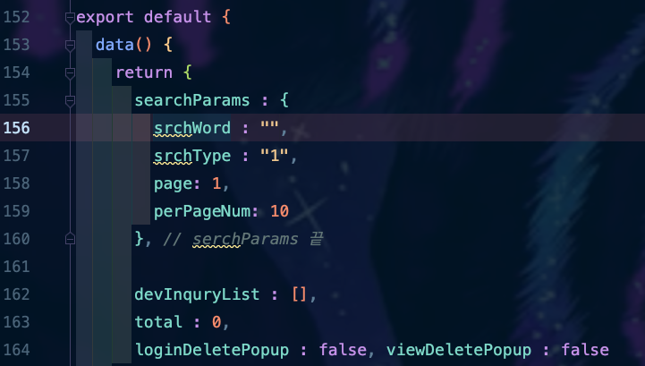 v-model ์์ฑ์ searchParams.srchWord๋ผ๋๊ฐ์ฒด๋ฅผ ๋ฃ์ด ์คฌ๋๋ฐ, ์ด๋ ๊ฒ ์ค์ ์ ํด ์ฃผ๊ฒ ๋๋ฉด <Script>์ data() return ๋ถ์์ ํด๋น ๊ฐ์ ์ฒ๋ฆฌํ ์ ์๋ ๊ฒ์ด์์.