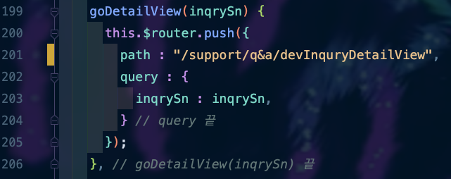 ๊ทธ๋ผ router๋ฅผ ํตํด Rendering์ ํ๊ฒ ๋๋๋ฐ, /src/views/support/q&a/devInquryDetailView Component๋ฅผ Renderingํ๊ฒ ๋๊ณ , ์์ธ ๊ฒ์๊ธ์ ๊ฐ์ ธ์ค๊ธฐ ์ํด query์ ๊ฒ์๊ธ ์ผ๋ จ๋ฒํธ๋ฅผ ๋ฃ์ด ๋ณด๋ด ์ฃผ๋ ๊ฒ์ด์์.
